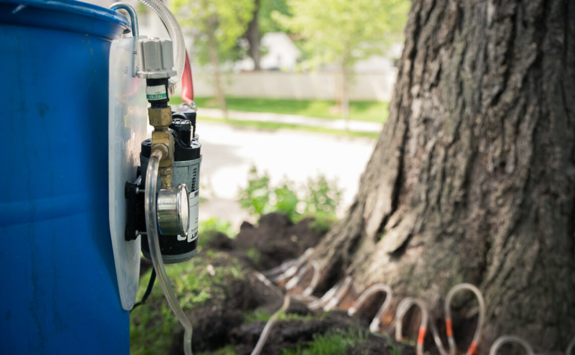 - Trunk injections involve drilling small holes at the base of the tree to deliver the product with specialized equipment. The tree’s vascular system will transport the product throughout the tree.